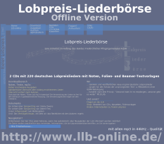 ![]() Die Ausgaben 1-16 komplett auf zwei CD ROMsDa das downloaden recht schnell zeitintensiv und damit teuer wird, haben wir für all die, die neu auf die Lobpreis-Lieder-Börse gestoßen sind und jetzt mal alles, was bisher erschienen ist, haben wollen, ein neues Angebot:Die Gesamtausgabe LLB 1 bis LLB 16 als website auf 2 CD ROMs inklusive Noten und mp3s von ALLEN 223 Liedern. Das ganze mit 44kHz sampling Frequenz, also besserer Qualität als auf dem webserver, weil auf den CDs mehr Platz ist. Zu bestellen auf unserer Bestellseite. Das ganze ist als Möglichkeit zum "Aufholen" gedacht, und natürlich braucht man zum Anhören der Lieder einen Computer mit mp3 player. Die zukünftigen LLB-Ausgaben werden wie gehabt erstmal ausschließlich auf gewöhnlicher Musik-CD bzw. hier auf der Webseite veröffentlicht.